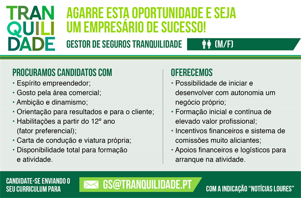 Candidate-se enviando o seu curriculum para: gs@tranquilidade.pt com a indicação "Notícias de Loures".