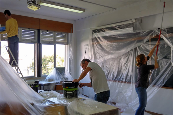 O sol convidava a um passeio e antecipava um dia primaveril. À hora marcada, como combinado, marcaram presença sem hesitar. Às costas, muito material de pintura, bricolagem e uma grande dose de boa vontade. Afinal, é pelas crianças e isso vale qualquer sacrifício. Os trabalhos começaram ainda antes das 09h30, num sábado soalheiro e garrido, sob o chilrear agudo dos pássaros que esvoaçavam perto das árvores. Estava na altura de pôr mãos à obra!